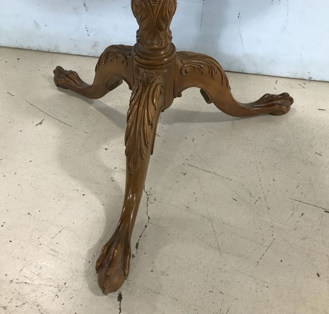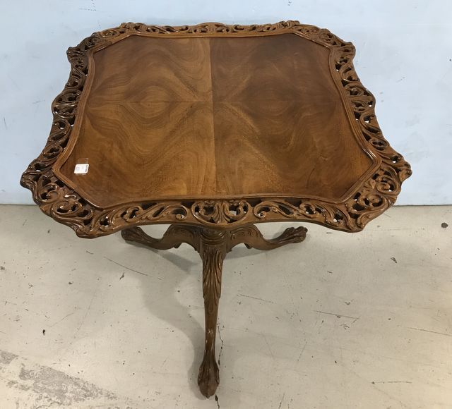 Early 1900's Mahogany Tilt Top Table, ornate carved border, square top, carved pedestal base with birds on prey claw-n-ball, has some base finish wear, good condition, 29"h., 29"w. Early 1900's Mahogany Tilt Top Table, ornate carved border, square top, carved pedestal base with birds on prey claw-n-ball, has some base finish wear, good condition, 29"h., 29"w.