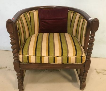 Vintage English Barley Twist Arm Chair, striped fabric, skirted back, has some finish fade on bottom, 27"h. Vintage English Barley Twist Arm Chair, striped fabric, skirted back, has some finish fade on bottom, 27"h.