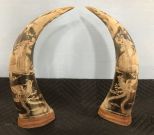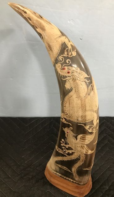 Vintage Mid Century Japanese Carved Ox Horns "Dragon", detailed carved artwork, wood bases, 16"h. Vintage Mid Century Japanese Carved Ox Horns "Dragon", detailed carved artwork, wood bases, 16"h.
