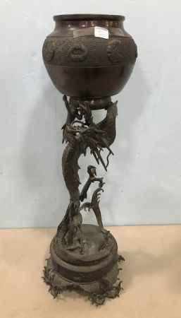Unusual Oriental Dragon Pedestal Planter, ornate metal artwork, dragon base with planter bowl, single piece, dark stain, 26"h. Unusual Oriental Dragon Pedestal Planter, ornate metal artwork, dragon base with planter bowl, single piece, dark stain, 26"h.
