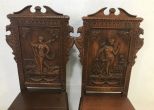 Lady and Gent Carved Renaissance Style Hall Chairs, antique, serpentine carved emblems, carved lady figures on back rest, 39"h. Lady and Gent Carved Renaissance Style Hall Chairs, antique, serpentine carved emblems, carved lady figures on back rest, 39"h.