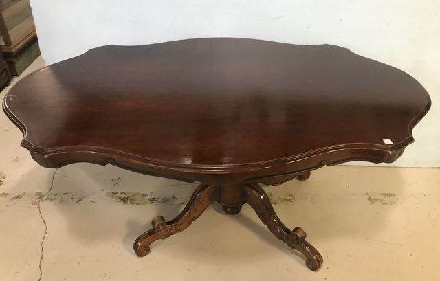 Vintage French Style Turtle Top Pedestal Table, ornate carved four leg pedestal, mahogany, top is removable, 30"h., 68"w., 42"d. Has some age wear. Vintage French Style Turtle Top Pedestal Table, ornate carved four leg pedestal, mahogany, top is removable, 30"h., 68"w., 42"d. Has some age wear.