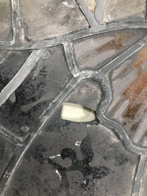 Antique Stain Glass Madonna and Child Panel, circle, leaded, has spot missing, 26"dia. Antique Stain Glass Madonna and Child Panel, circle, leaded, has spot missing, 26"dia.