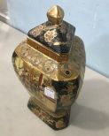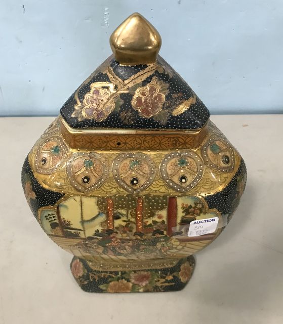 Reproduction Satsuma Hand Painted Urn, made in China, hand painted, gold embroidery, with lid, 14"h. Reproduction Satsuma Hand Painted Urn, made in China, hand painted, gold embroidery, with lid, 14"h.