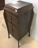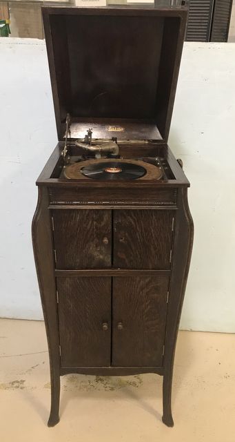 Karna Gramophone Victrola, oak case, has collection of album records, needs work, crank needs to be reattached, 39"h., 16"w. Karna Gramophone Victrola, oak case, has collection of album records, needs work, crank needs to be reattached, 39"h., 16"w.