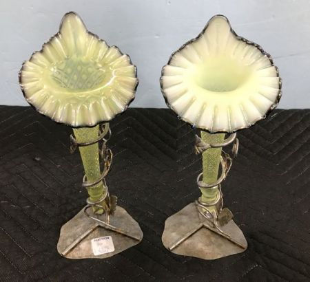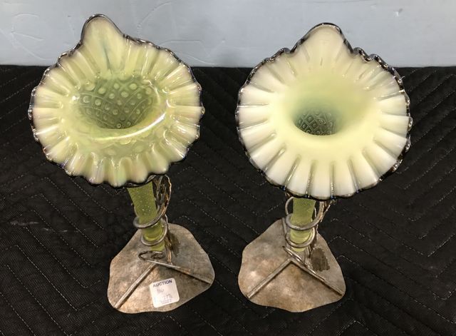 Pair of Glass Opalescent Horn Flutes, metal grape vine base, 11"h. Pair of Glass Opalescent Horn Flutes, metal grape vine base, 11"h.