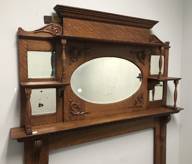 Vintage oak fireplace mantel, two pieces, top display shelves with oval beveled mirror, carved trim wood, some silver wear in mirrors, good condition, 81"h., total width is 60"w, into between legs are 54"w. Vintage oak fireplace mantel, two pieces, top display shelves with oval beveled mirror, carved trim wood, some silver wear in mirrors, good condition, 81"h., total width is 60"w, into between legs are 54"w.