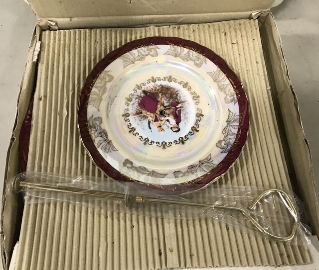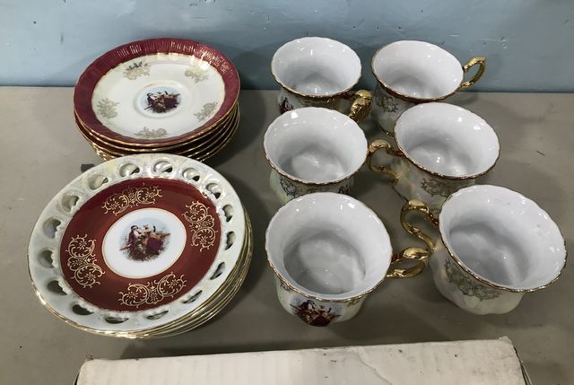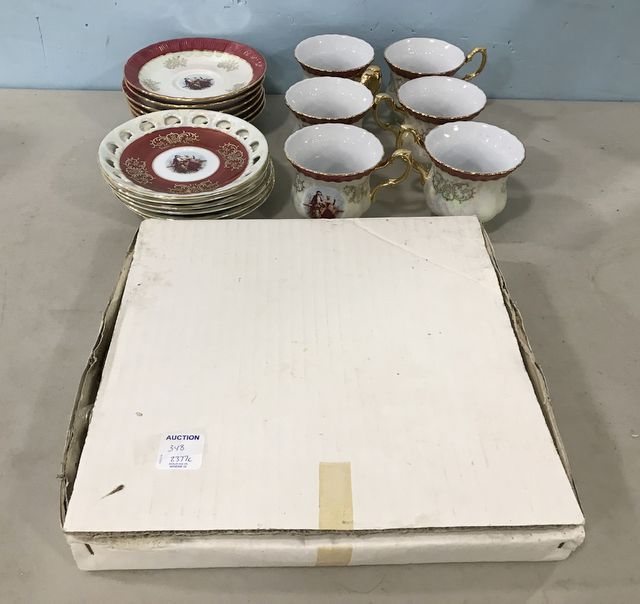 Vintage Cosmos Japan Import Colonial Couple Porcelain, group of saucers, 6 cups, and two tier serving stand in box. Vintage Cosmos Japan Import Colonial Couple Porcelain, group of saucers, 6 cups, and two tier serving stand in box.