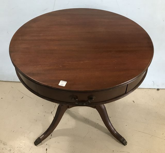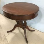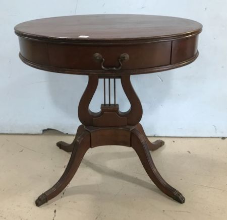 Duncan Phyfe Style Round Drum Table, single drawer, harp base, brass claw feet, 28"h., 28"dia. Duncan Phyfe Style Round Drum Table, single drawer, harp base, brass claw feet, 28"h., 28"dia.