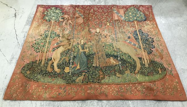 Hand Made English Wall Tapestry, Editions: Dart: De: Rambovillet, reproduction, makers tag, 54"h., 64"w. Hand Made English Wall Tapestry, Editions: Dart: De: Rambovillet, reproduction, makers tag, 54"h., 64"w.