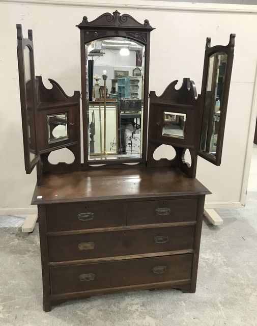Vintage Dresser with Tri Fold Dressing Mirrors, four drawers (need adjusting), corner mirrored storage, beveled center mirror, two side mirrors, has wear on finish, 72"h., 42"w., 19"w. Vintage Dresser with Tri Fold Dressing Mirrors, four drawers (need adjusting), corner mirrored storage, beveled center mirror, two side mirrors, has wear on finish, 72"h., 42"w., 19"w.