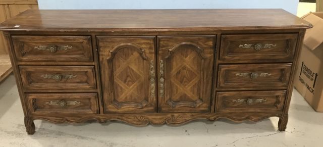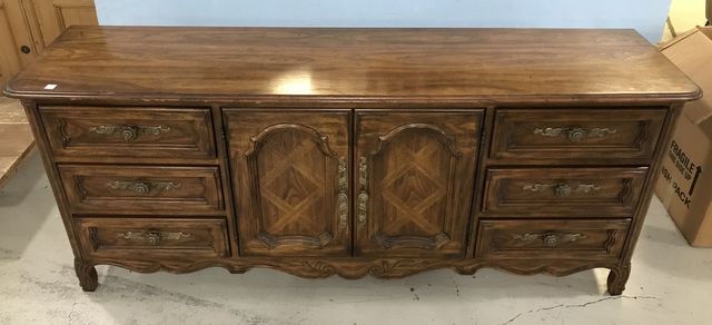 Cabernet Triple Dresser by Drexel, French style with 6 drawers, double doors with inner drawers, average condition, includes matching wall mirror, 31"h., 77"w., 20"d. Cabernet Triple Dresser by Drexel, French style with 6 drawers, double doors with inner drawers, average condition, includes matching wall mirror, 31"h., 77"w., 20"d.