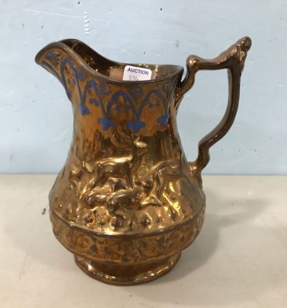 English Copper Lusterware Pitcher, blue painted trim, deer imagery, 7"h. English Copper Lusterware Pitcher, blue painted trim, deer imagery, 7"h.