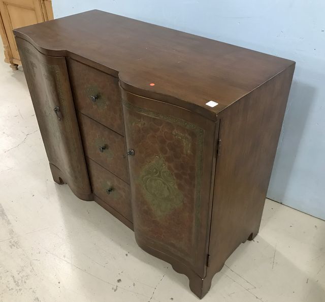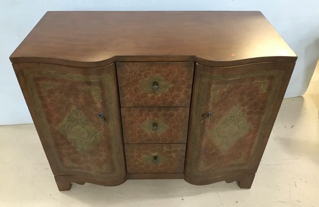 Modern decorative Commode, double door, with three center drawers, bow front, made in China, 34"h., 42"w., 19"d. Modern decorative Commode, double door, with three center drawers, bow front, made in China, 34"h., 42"w., 19"d.