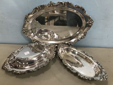 International Silver Company "Orleans" Silver Plate Trays, large tray 20"w., meat dome, and small tray. International Silver Company "Orleans" Silver Plate Trays, large tray 20"w., meat dome, and small tray.