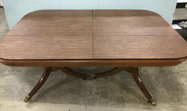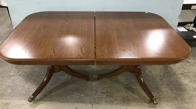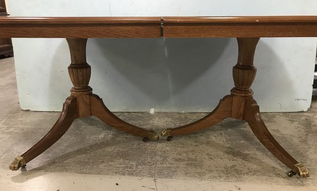 Bassett Oak Finish Double Pedestal Dinning Table, brass paw feet with wheels, padded, has two leaves, 30"h., 64"L., 43"w. Bassett Oak Finish Double Pedestal Dinning Table, brass paw feet with wheels, padded, has two leaves, 30"h., 64"L., 43"w.