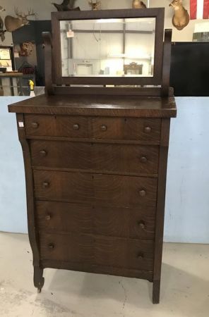 Antique Oak High Boy Chest of Drawers, dark stained oak chest, 6 drawers, top mirror, on casters, one is missing caster, 50"h., 34"w., 20"d. Antique Oak High Boy Chest of Drawers, dark stained oak chest, 6 drawers, top mirror, on casters, one is missing caster, 50"h., 34"w., 20"d.