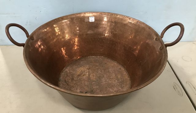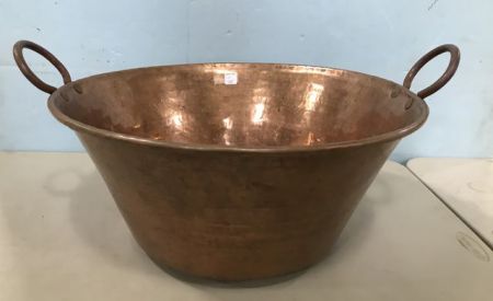 Large Copper Hammered Log Holder, handled, good condition, 9"h., 21"dia. Large Copper Hammered Log Holder, handled, good condition, 9"h., 21"dia.
