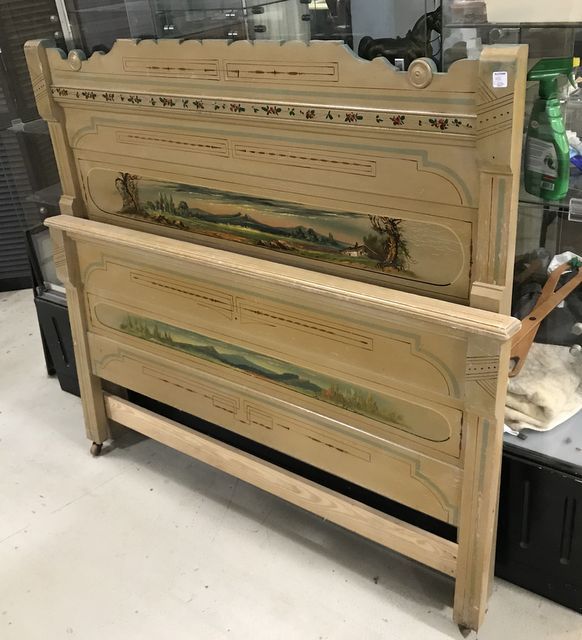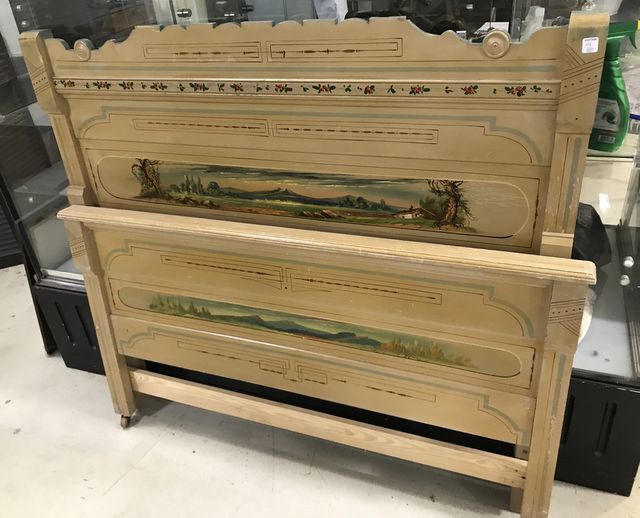 Vintage Eastlake Style Painted Full Size Bed, painted with mountain scenes, headboard and footboard, no rails. Vintage Eastlake Style Painted Full Size Bed, painted with mountain scenes, headboard and footboard, no rails.