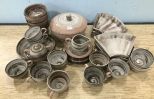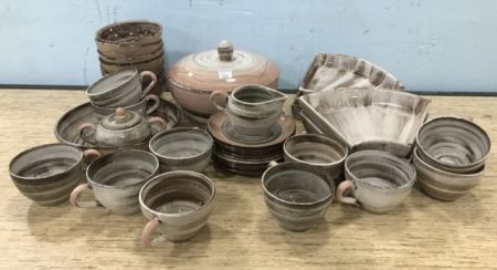 Santa Anita Ware "Vreni" Set, brown and pink, covered dish, 6 serving trays, 8 bowls, serving bowl, 9 saucers, 11 cups, creamer, sugar. Santa Anita Ware "Vreni" Set, brown and pink, covered dish, 6 serving trays, 8 bowls, serving bowl, 9 saucers, 11 cups, creamer, sugar.