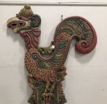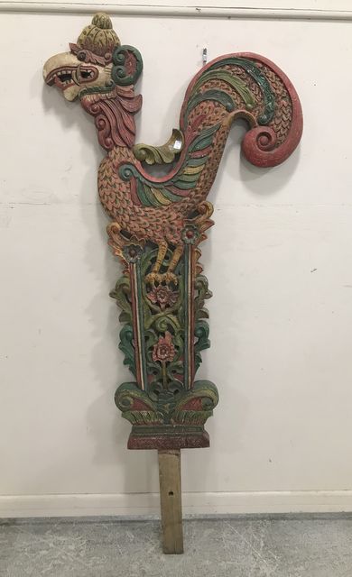 Tall wood carved tribal rooster decor pole, hand painted, ornate carved designs, has age, 77"h., 32"w. Tall wood carved tribal rooster decor pole, hand painted, ornate carved designs, has age, 77"h., 32"w.