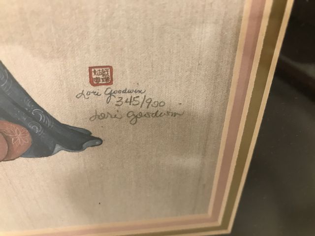 Artist Signed Geisha Block Print, signed Lori Goodwin, numbered 345/900, framed, 20"h., 18"w. Artist Signed Geisha Block Print, signed Lori Goodwin, numbered 345/900, framed, 20"h., 18"w.