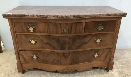 Antique Victorian Style Bow Front Marble Top Dresser, five drawers, walnut, has finish fade and wear, on casters, 30"h., 50"w., 22"d. Antique Victorian Style Bow Front Marble Top Dresser, five drawers, walnut, has finish fade and wear, on casters, 30"h., 50"w., 22"d.