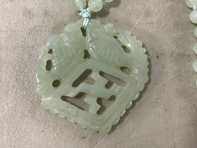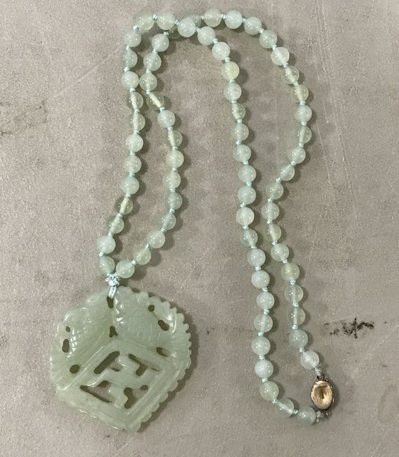 Jade beaded necklace with jade fish pendent. Jade beaded necklace with jade fish pendent.