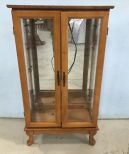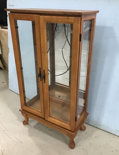 Modern two door Queen Anne glass curio display, glass door and side panels, mirrored back, lighted, has glass shelves, 43"h., 24"w., 12"d. Modern two door Queen Anne glass curio display, glass door and side panels, mirrored back, lighted, has glass shelves, 43"h., 24"w., 12"d.
