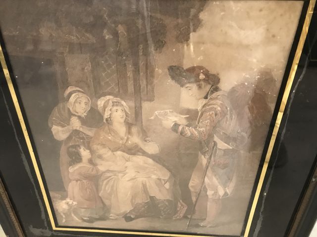 Antique English print with Man with family, framed, glass front, 21"h., 19"w. Antique English print with Man with family, framed, glass front, 21"h., 19"w.