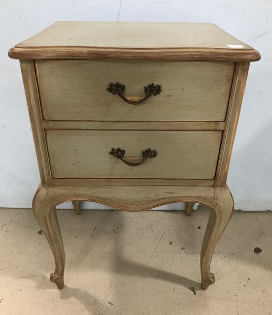 Painted French Style Night Stand, distressed, two drawer, 27"h., 18"w., 14"d. Painted French Style Night Stand, distressed, two drawer, 27"h., 18"w., 14"d.
