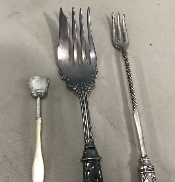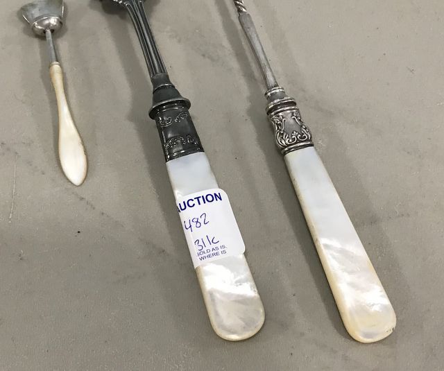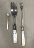Mother of pearl sterling band silver plate meat fork, sterling band silver plate pickle fork, and mother of pearl scoop. Mother of pearl sterling band silver plate meat fork, sterling band silver plate pickle fork, and mother of pearl scoop.