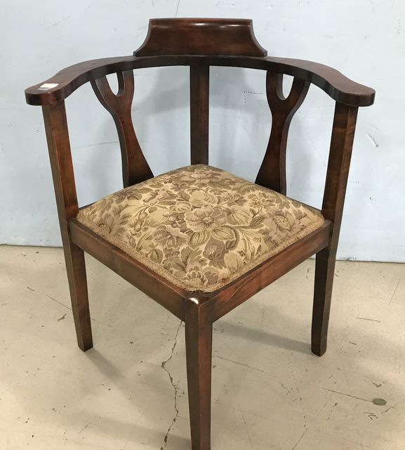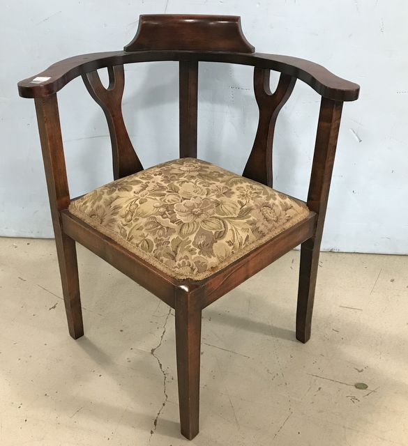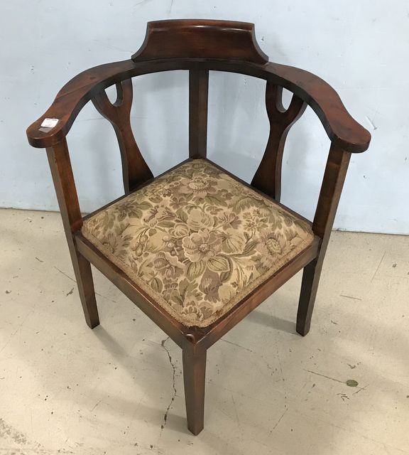 Antique Chippendale Corner Chair, upholstery seat, floral design, 27"h., 23"w. Antique Chippendale Corner Chair, upholstery seat, floral design, 27"h., 23"w.