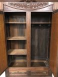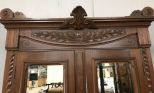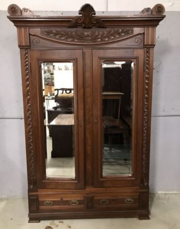Antique Walnut Victorian Double Door Armoire, beveled mirror double door, two drawers, breaks down, left side has shelves, right side clothes hanger, carved inverted dentel, rosettes, oak leaf & acorns, burl inlay, heavily carved feathered crows, brass hardware, 91"h., 54"w., 18"d. Antique Walnut Victorian Double Door Armoire, beveled mirror double door, two drawers, breaks down, left side has shelves, right side clothes hanger, carved inverted dentel, rosettes, oak leaf & acorns, burl inlay, heavily carved feathered crows, brass hardware, 91"h., 54"w., 18"d.