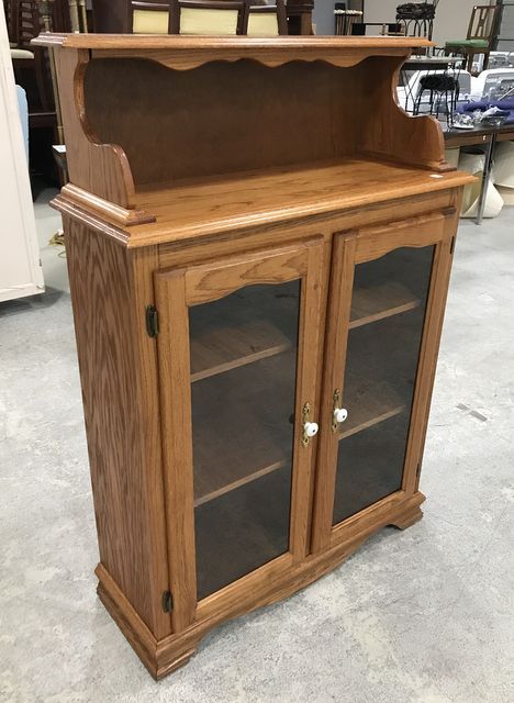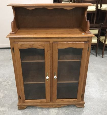 Modern oak double door bookcase cabinet, glass panel doors, two shelves, top display gallery crest, footed, white pulls, good condition, 55"h., 38"w., 15"d. Modern oak double door bookcase cabinet, glass panel doors, two shelves, top display gallery crest, footed, white pulls, good condition, 55"h., 38"w., 15"d.