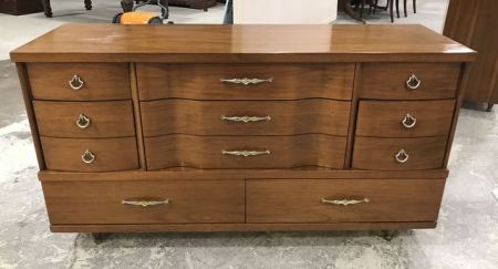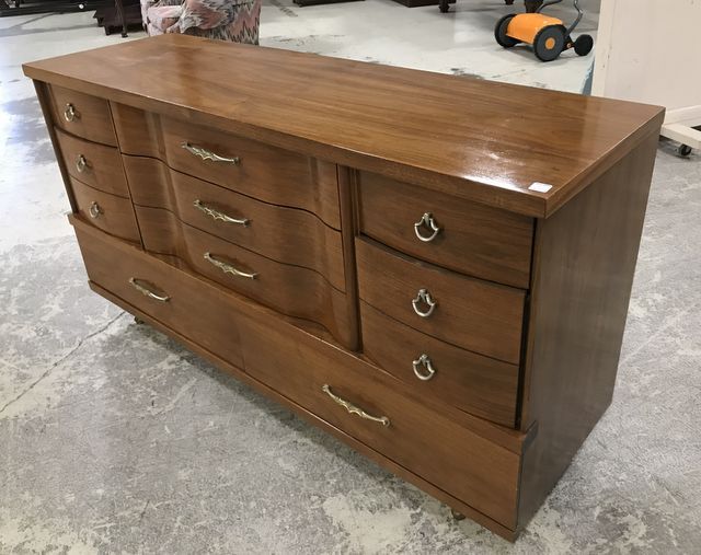 Mid Century style triple dresser, serpentine middle drawers, two bottom drawers, three side drawers, footed, good condition, 31"h., 58"w., 18"d. Mid Century style triple dresser, serpentine middle drawers, two bottom drawers, three side drawers, footed, good condition, 31"h., 58"w., 18"d.