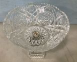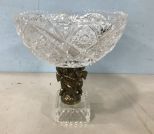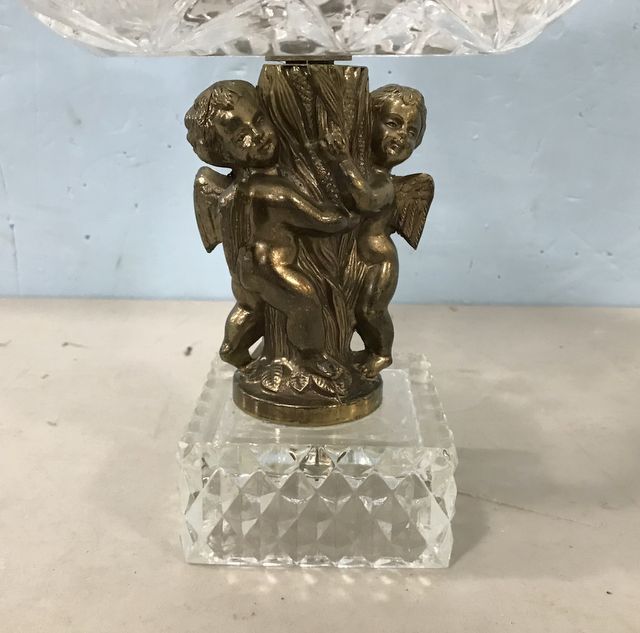 Pressed Glass Cherub Center Piece Compote, pressed glass bowl and base, metal brass color cherubs supports, 11"h., 10"w. Pressed Glass Cherub Center Piece Compote, pressed glass bowl and base, metal brass color cherubs supports, 11"h., 10"w.