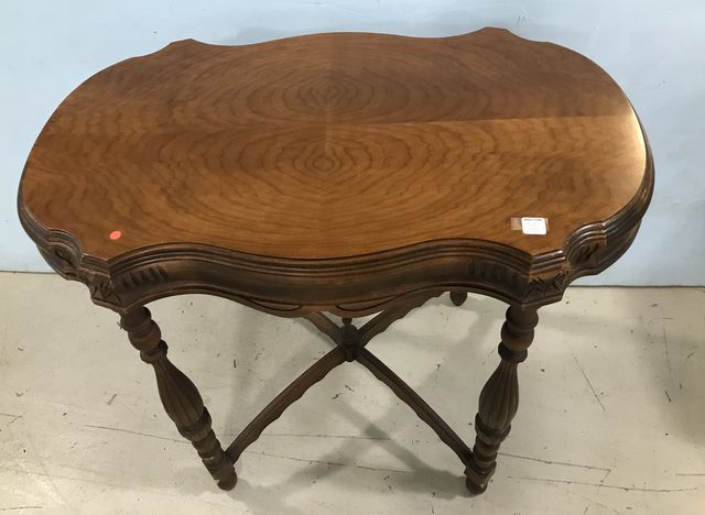 Depression Era Turtle Top Parlor Table, carved, walnut, average condition, 29"h., 33"w. Depression Era Turtle Top Parlor Table, carved, walnut, average condition, 29"h., 33"w.