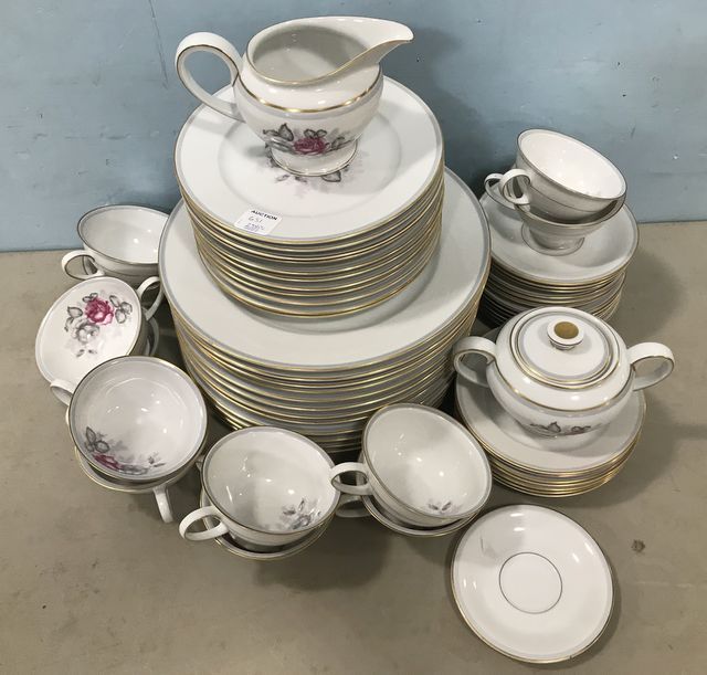 Rosen Chale Germany "Gray Dawn" China Set, 12 dinner plates, 11 salad plates, 7 dessert plates, 12 saucers, 12 cups, creamer, sugar. Rosen Chale Germany "Gray Dawn" China Set, 12 dinner plates, 11 salad plates, 7 dessert plates, 12 saucers, 12 cups, creamer, sugar.