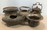 New metal rustic biscuit jar, silver plate bowl, ropouse silver plate handled pitcher, copper footed planter, modern pottery fish planter. New metal rustic biscuit jar, silver plate bowl, ropouse silver plate handled pitcher, copper footed planter, modern pottery fish planter.
