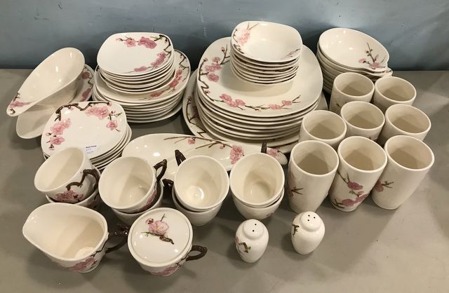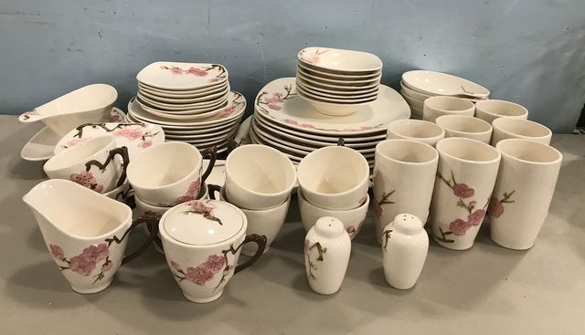 "Peach Blossom" Poppytrail China Set, 7 dinner plates, platter, 8 bowls, 8 saucers, 8 salad plates, gravy, salt & pepper, creamer, cups, mugs. "Peach Blossom" Poppytrail China Set, 7 dinner plates, platter, 8 bowls, 8 saucers, 8 salad plates, gravy, salt & pepper, creamer, cups, mugs.