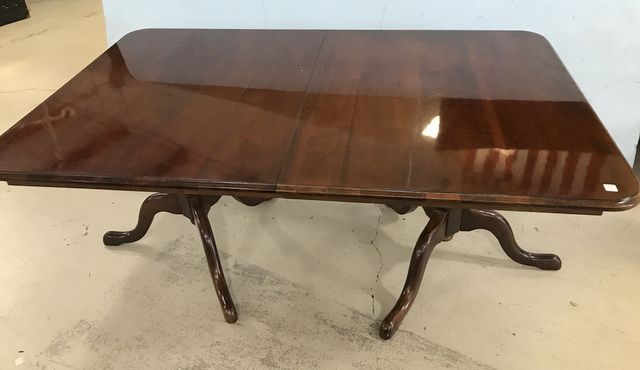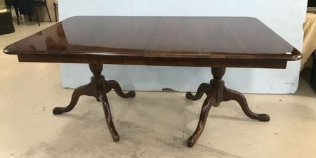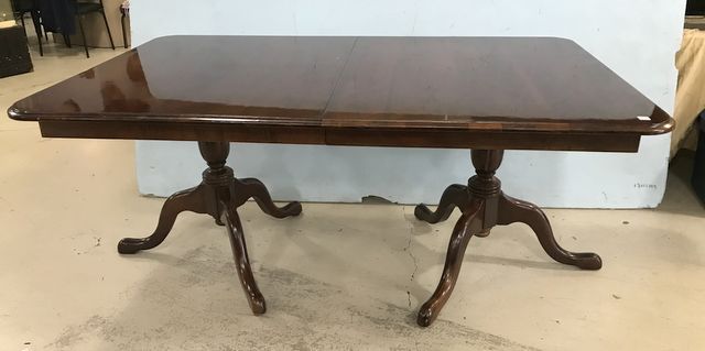 Reproduction Queen Anne Mahogany Double Pedestal Dinning Table, normal swirl marks on top, has two leaves, pads, 29"h., 68"w., 43"d. Reproduction Queen Anne Mahogany Double Pedestal Dinning Table, normal swirl marks on top, has two leaves, pads, 29"h., 68"w., 43"d.