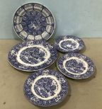 Italian Blue and White Plates, three small wall hanging plates, one large plate, and Spode Blue Room calender plate. Italian Blue and White Plates, three small wall hanging plates, one large plate, and Spode Blue Room calender plate.