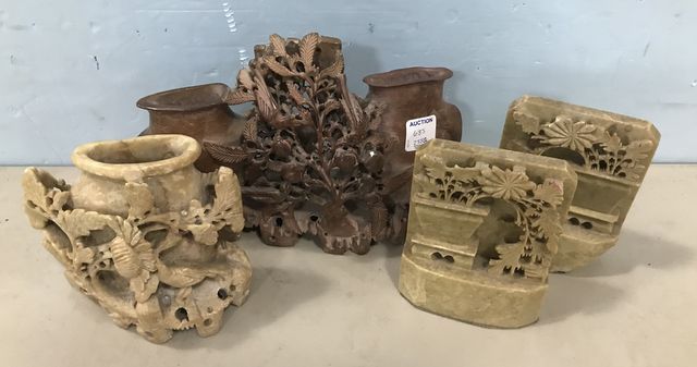 Soapstone vase decor, ornate, two bookends (one has chip). Soapstone vase decor, ornate, two bookends (one has chip).