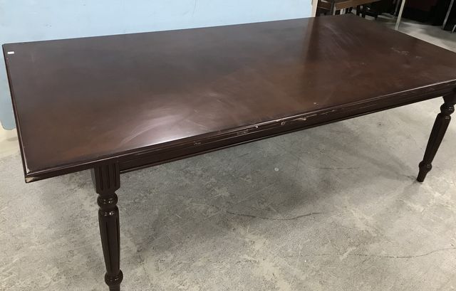 Large Modern Dinning/Conference Style Table, one piece, no leaves, bolt on legs, has swirls and wear on top, rectangle, 29"h., 93"w., 46"d. Large Modern Dinning/Conference Style Table, one piece, no leaves, bolt on legs, has swirls and wear on top, rectangle, 29"h., 93"w., 46"d.