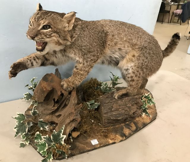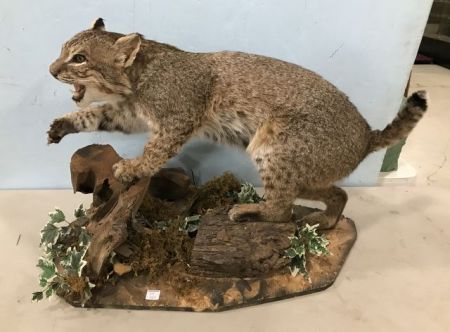 Bobcat Taxidermy Mount, on wood base, foot has damage, 20"h., 30"w. Bobcat Taxidermy Mount, on wood base, foot has damage, 20"h., 30"w.