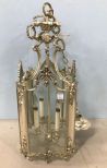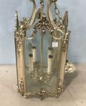 Ornate Silver Tone Metal Hanging Lantern Fixture, glass panels, four arm lights, 28"h. Ornate Silver Tone Metal Hanging Lantern Fixture, glass panels, four arm lights, 28"h.