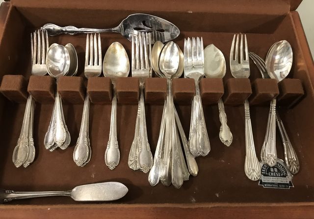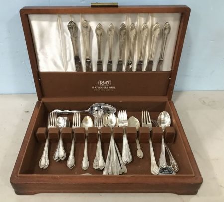 WM Rogers Silver Plate Flatware Set, with box, forks, spoons, tea spoons, salad forks, knives. WM Rogers Silver Plate Flatware Set, with box, forks, spoons, tea spoons, salad forks, knives.