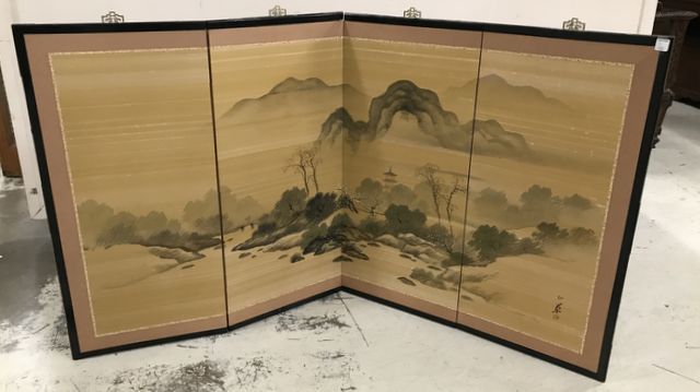 Oriental Four Panel Folding Screen, river landscape, black frame, 36"h. Oriental Four Panel Folding Screen, river landscape, black frame, 36"h.
