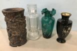 Grecian style pottery vase 11"h., Koriental Imports brass vase, crimped purple glass vase, heavy etched glass vase. Grecian style pottery vase 11"h., Koriental Imports brass vase, crimped purple glass vase, heavy etched glass vase.